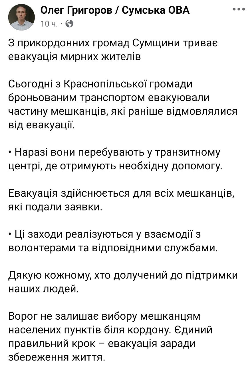 Но вчера вечером губернатор заявил, что в Краснопольском районе (где и находится Грабовское) прошла эвакуация тех, кто раньше от нее отказывался.