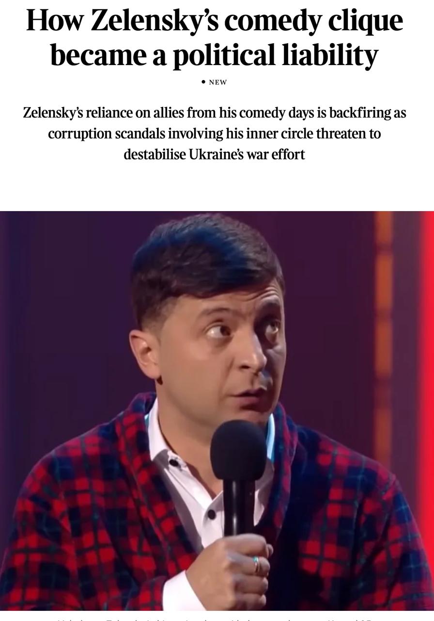 В ней сказано, что "зависимость Зеленского от союзников времён его комедийной карьеры оборачивается против него самого", а коррупционные скандалы с участием ближайшего окружения "грозят обернуться катастрофой для его президентства и военных усилий".