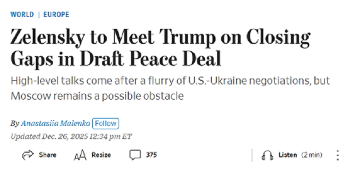 По информации издания, Зеленский настаивал на встрече с Трампом для урегулирования разногласий по проекту 20-пунктного мирного соглашения и другим элементам мирного договора, которые обсуждаются между Украиной и США, в частности по вопросам Донбасса.