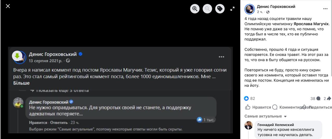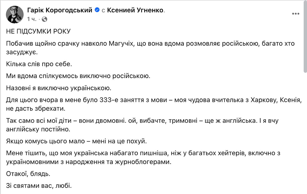 За Магучих заступился бизнесмен Гарик Корогодский. Он написал, что дома тоже общается только на русском, хотя в публичной сфере полностью перешёл на украинский.