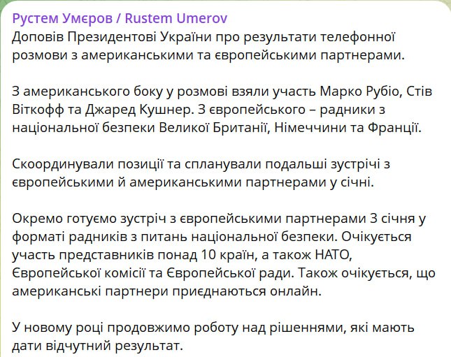 "Скоординировали позиции и спланировали дальнейшие встречи с европейскими и американскими партнёрами в январе. Отдельно готовим встречу с европейскими партнёрами 3 января в формате советников по национальной безопасности. Ожидается участие представителей более 10 стран, а также НАТО, Европейской комиссии и Европейского совета. Также ожидается, что американские партнёры подключатся онлайн", – написал Умеров.