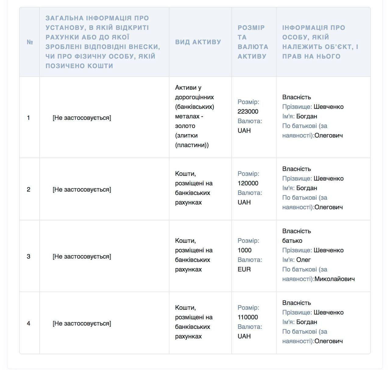 Бывший водитель Кировоградского областного территориального центра комплектования Богдан Шевченко задекларировал в 2025 году золотые слитки на 220 тыс. грн.