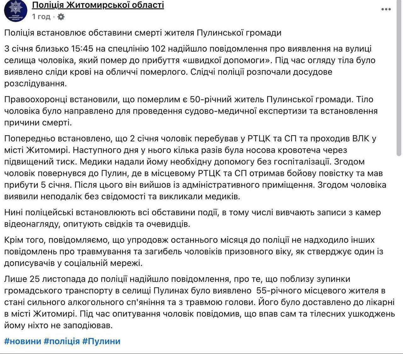 "2 января мужчина находился в РТЦК и СП и проходил ВЛК в г. Житомире. На следующий день у него несколько раз шла кровь из носа из-за высокого кровяного давления. Врачи оказали ему необходимую помощь без госпитализации", - говорится в сообщении.