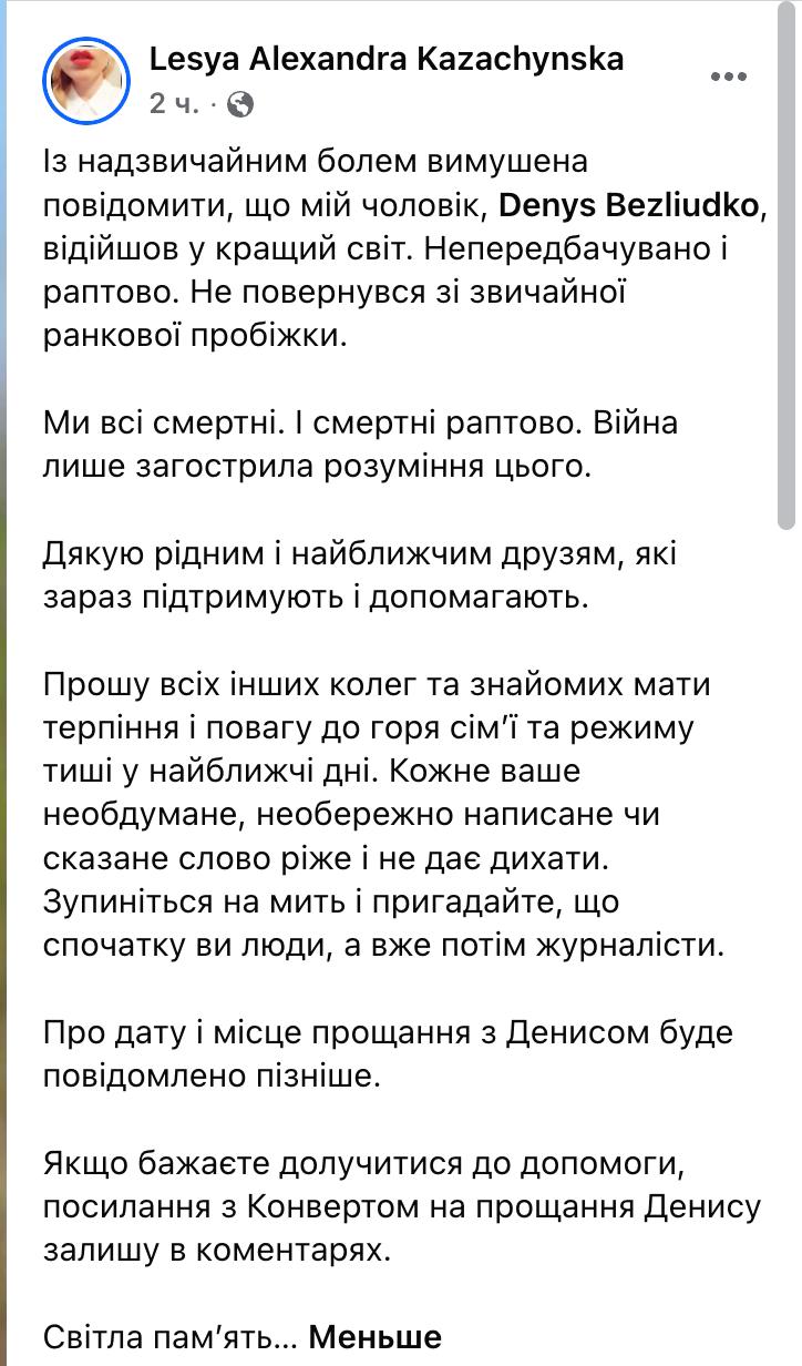 "С чрезвычайной болью вынуждена сообщить, что мой муж, Денис Безлюдько, отошел в лучший мир. Непредсказуемо и внезапно. Не вернулся с обычной утренней пробежки", - написала Леся Казачинская.