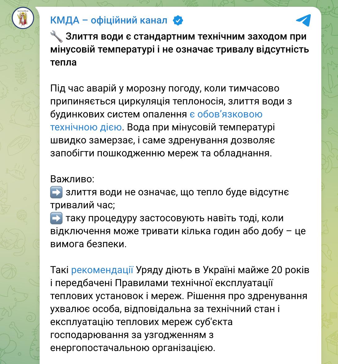 Воду слили, пока будет продолжаться восстановление тепла. Администрация сообщает, что ситуация в Киеве "чрезвычайно сложная, но контролируется".