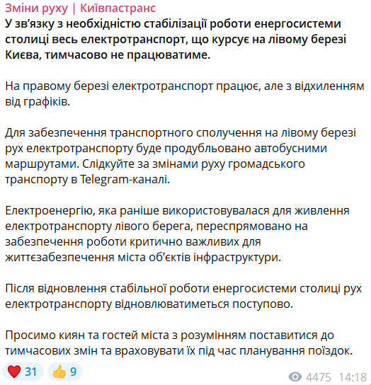 "Электроэнергию, которая ранее использовалась для питания электротранспорта левого берега, перенаправлена  на обеспечение работы критически важных для жизнеобеспечения города объектов инфраструктуры", - пояснили на предприятии.