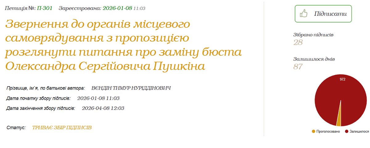 В ней предлагается перенести бюст Пушкина в музей. При этом авторы требуют, чтобы демонтаж бюста поэту был вынесен на общественное обсуждение и учесть мнение одесситов.