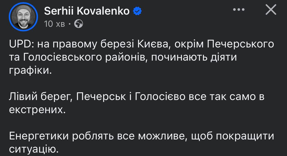 13.46 Экстренные отключения света вводятся по всему Киеву, сообщает гендиректор Yasno.