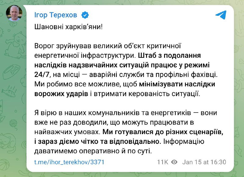 16:33 В Харькове разрушен крупный объект энергетики, сообщил мэр Терехов.