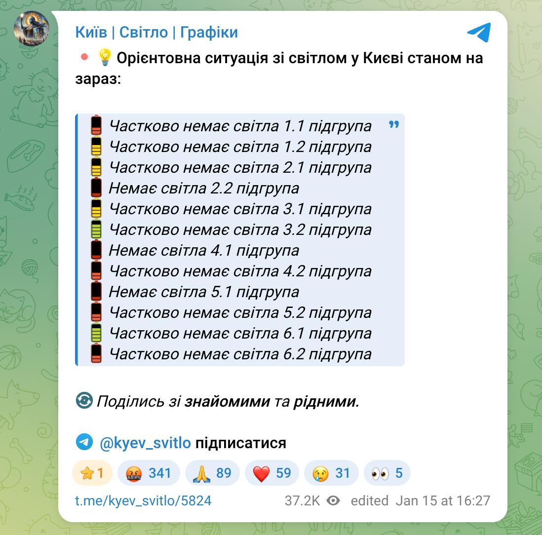 Паблики, отслеживающие ситуацию со светом в столице, сообщают, что света нет полностью или частично у всех подгрупп.