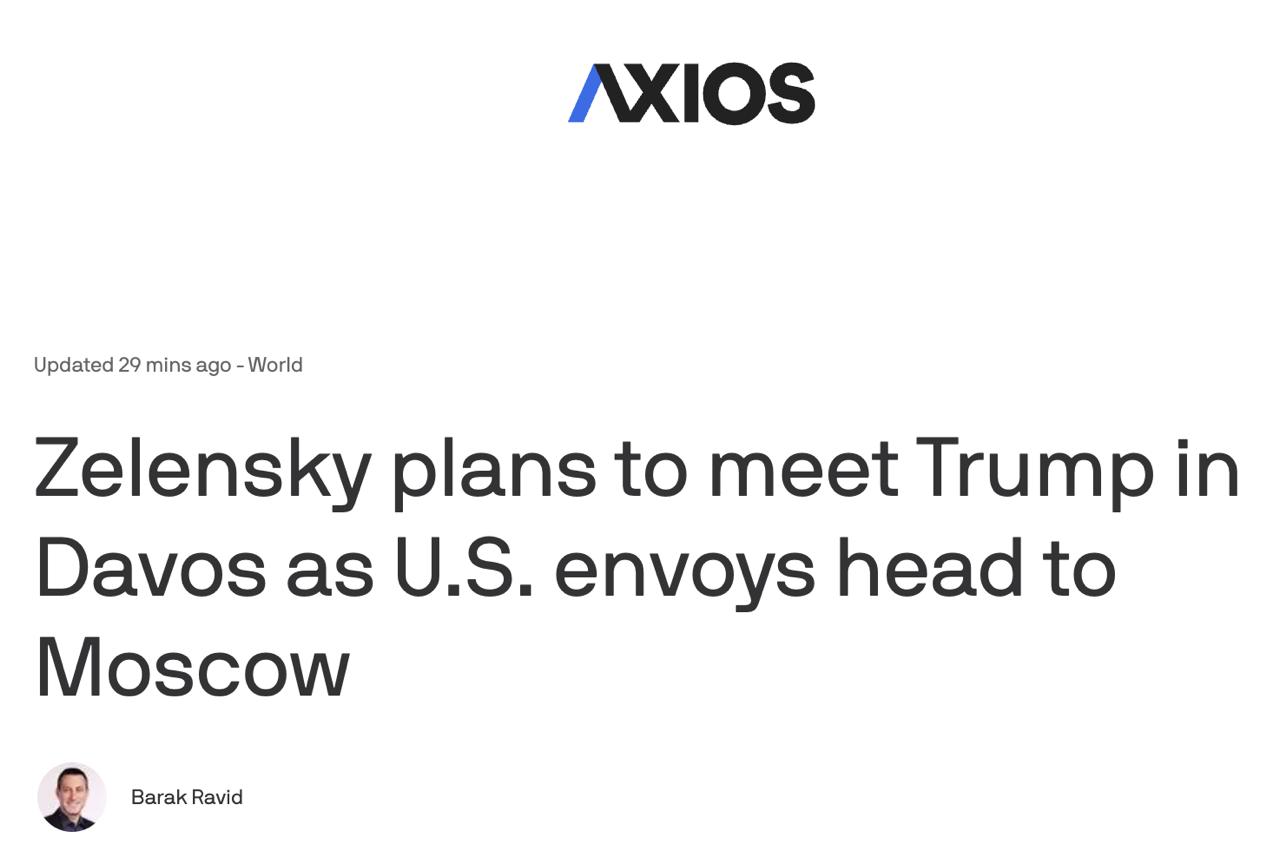 По данным Axios, встреча Зеленского и Трампа состоится завтра в Давосе. Об этом изданию сообщил украинский чиновник.