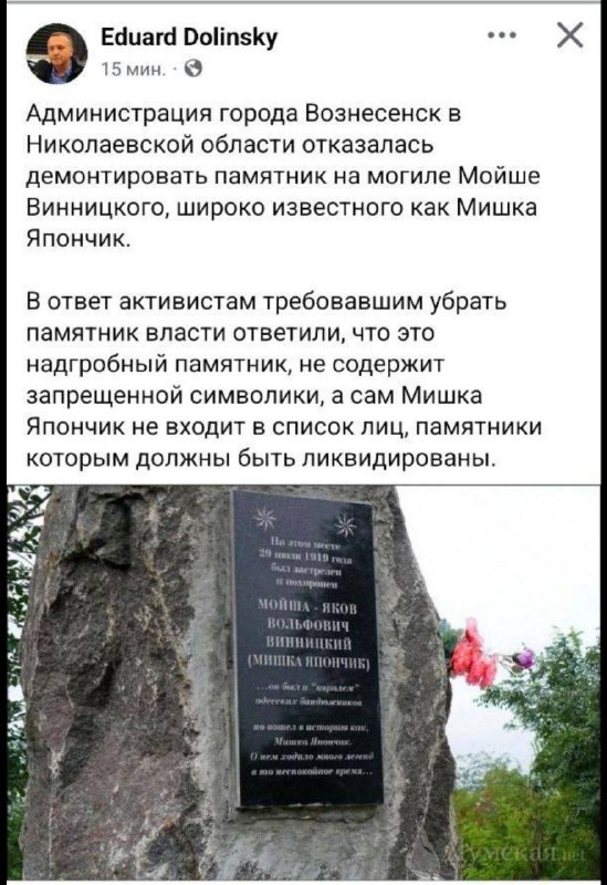 "В ответ активистам, требовавшим убрать памятник, власти заявили, что это надгробие, оно не содержит запрещенной символики, а сам Мишка Япончик не входит в список лиц, памятники которым должны быть ликвидированы", - написал Долинский.