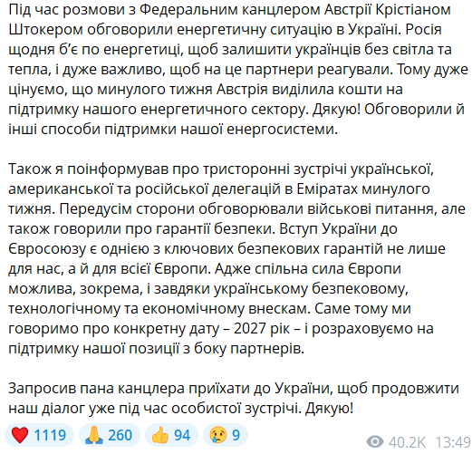 "Очень ценим, что на прошлой неделе Австрия выделила средства на поддержку нашего энергетического сектора. Также я проинформировал (Штокера - Ред.) о трёхсторонних встречах украинской, американской и российской делегаций в Эмиратах на прошлой неделе. Прежде всего стороны обсуждали военные вопросы, но также говорили о гарантиях безопасности. Вступление Украины в Евросоюз является одной из ключевых гарантий безопасности не только для нас, но и для всей Европы. Ведь общая сила Европы возможна, в частности, и благодаря украинскому безопасному, технологическому и экономическому вкладу. Именно поэтому мы говорим о конкретной дате - 2027 год - и рассчитываем на поддержку нашей позиции со стороны партнеров", - сказано в публикации президента.