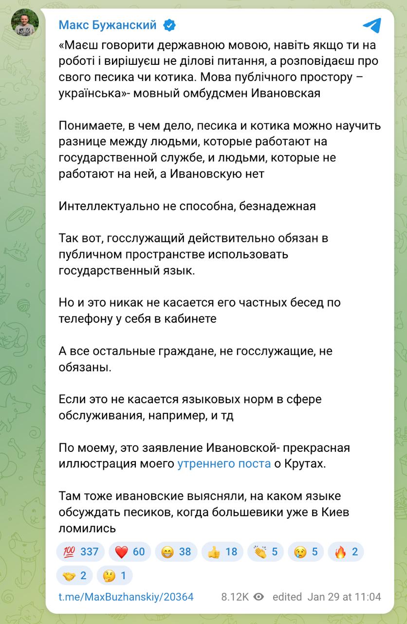 "Понимаете, в чём дело, песика и котика можно научить разнице между людьми, которые работают на государственной службе, и людьми, которые не работают на ней, а Ивановскую нет",- написал Бужанский в своем телеграм-канале.