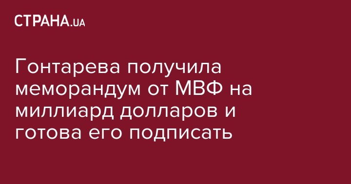 Глава Национального банка Украины Валерия Гонтарева заявила, что она получила и подпишет меморандум с МВФ на предоставление миллиардного транша. Об этом пишет "РБК-Украина".