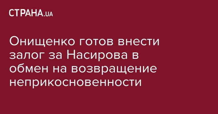 Беглый олигарх-нардеп Александр Онищенко, который скрывается от украинских властей в Лондоне, заявил "Стране", что готов внести за отстраненного главы ГФС Романа Насирова залоговую сумму в 100 млн грн, который ему присудил Соломенский суд города Киева. "Я готов. Пусть Петру Алексеевичу Порошенко станет немножко стыдно перед его верным соратником Насировым. Что я хочу взамен? Пусть вернут мне депутатскую неприкосновенность".