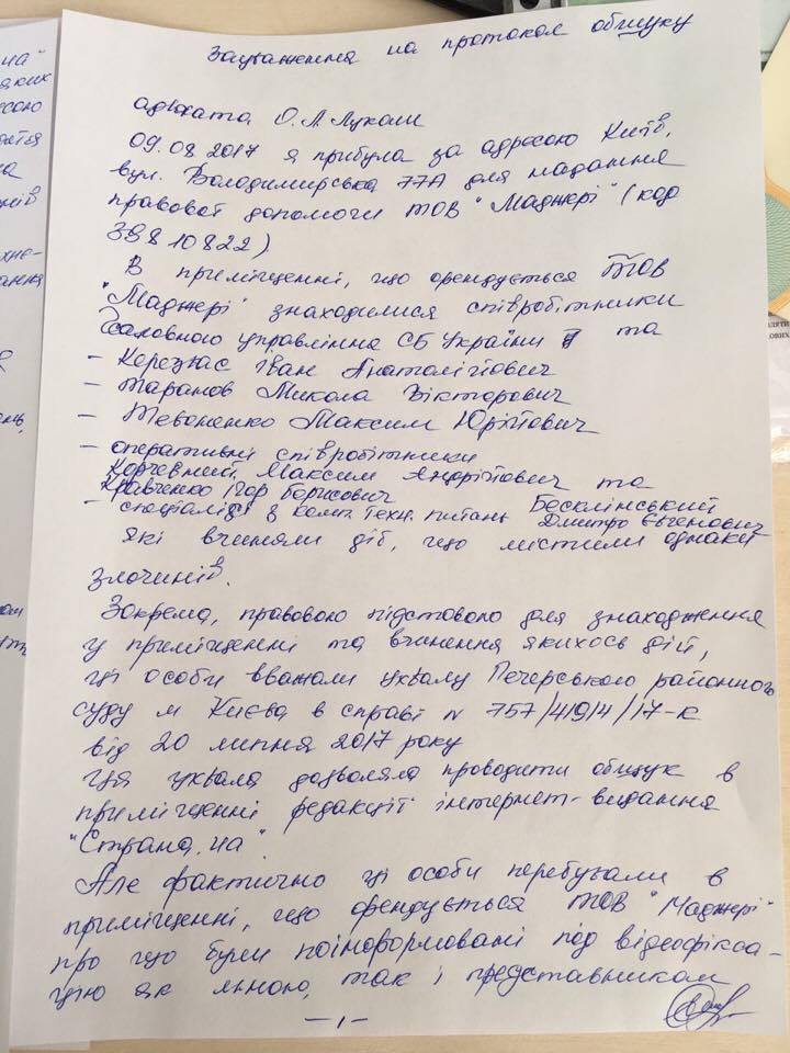 Адвокат "Страны" Елена Лукаш написала претензию СБУ на обыск, проведенный сегодня в офисе нашего издания. Главная претензия к правоохранителям - отсутствие прав на обыск в данном помещении. Ведь по адресу, куда сегодня явились сбушники, находится иное юридическое лицо - ООО Маджери, которое вообще не указано в решении суда.