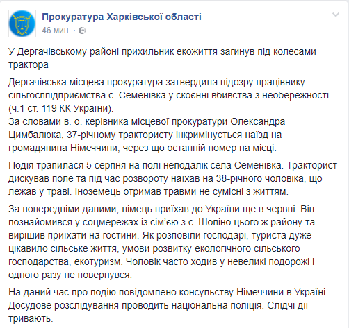 Местная прокуратура утвердила подозрение работнику сельхозпредприятия с. Семеновка в совершении убийства по неосторожности (ч.1 ст. 119 УК Украины). И.о. руководителя местной прокуратуры Александр Цимбалюк сообщил, что 37-летнему трактористу инкриминируется наезд на гражданина Германии, из-за чего последний скончался на месте.