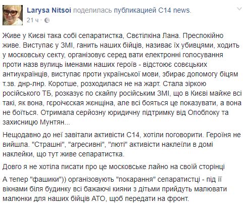 Радикалы из группировки С-14 собираются провести акцию под окнами киевлянки Светланы Светилкиной, которую считают "сепаратисткой". Об этом в Facebook сообщила писательница Лариса Ницой, призывая своих подписчиков прийти на акцию.