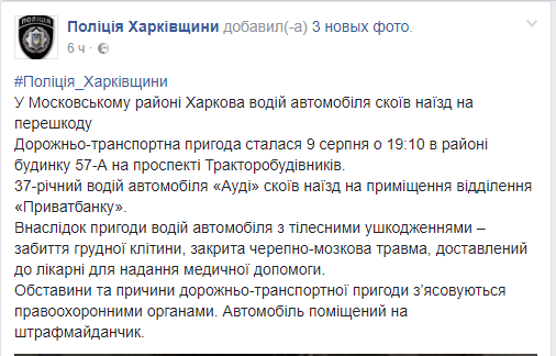 В Харькове в районе дома 57-А по проспекту Тракторостроителей автомобиль въехал в помещение отделения "Приватбанка", водитель получил травмы. Об этом сообщает пресс-служба местной полиции в Facebook.
