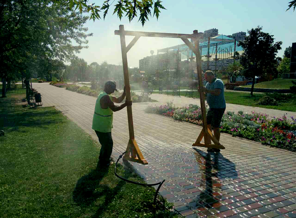 Всего смонтировали 17 рамок. Материалом для них стала древесина, полученная с аварийных деревьев после санитарной обрезки. Также в конструкции прикреплены 10 форсунок-распылителей воды.