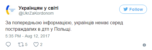 В то же время, Департамент консульской службы МИД сообщил в Twitter, что, по предварительной информации, среди пострадавших в ДТП в Польше украинцев нет.
