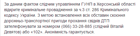 В субботу, 12 августа, около 12:30 в дежурную часть Олешковского отделения полиции позвонил мужчина и сообщил, что неподалеку от города на автодороге "Олешки - Голая Пристань" произошло ДТП с пострадавшими. На место происшествия выехала следственно-оперативная группа отделения полиции и сотрудники следственного управления областного главка полиции.