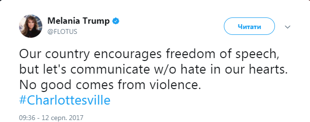 "Наша страна поощряет свободу слова, но давайте разговаривать без ненависти в сердцах. Насилие ни к чему хорошему не приведет", - написала Меланья Трамп в своем Twitter.