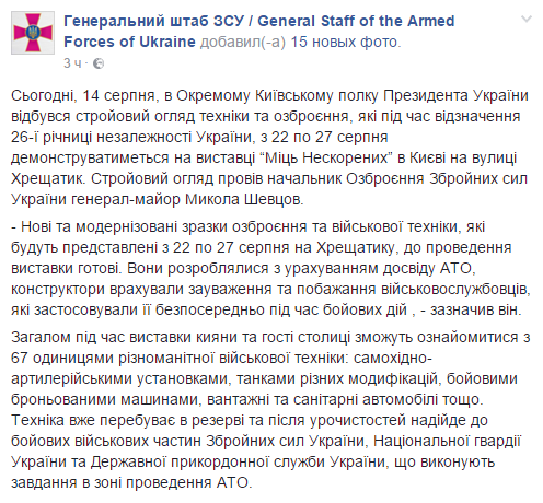 "Во время выставки киевляне и гости столицы смогут ознакомиться с 67 единицами разнообразной военной техники: самоходно-артиллерийскими установками, танками различных модификаций, боевыми бронированными машинами, грузовыми и санитарными автомобилями и тому подобным. Техника уже находится в резерве и после торжеств поступит в боевые военные части Вооруженных сил Украины, Национальной гвардии Украины и Государственной пограничной службы Украины, выполняющие задание в зоне проведения АТО", - говорится в сообщении, опубликованном на странице Генштаба в соцсети Facebook.