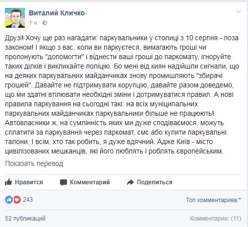 "Друзья! Хочу еще раз напомнить: парковщики в столице с 10 августа - вне закона! И если с вас, когда вы паркуетесь, вымогают деньги или предлагают "помочь" и отнести ваши деньги к паркомату, игнорируйте таких дельцов и вызывайте полицию. Потому что мне от киевлян поступили сигналы, что на некоторых парковочных площадках вновь промышляют "собиратели денег", - написал он.