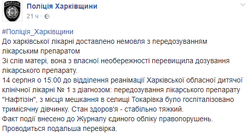 В реанимацию харьковской областной детской клинической больницы был доставлен трехмесячный младенец в связи с передозировкой нафтизина. Об этом в Facebook сообщает полиция области.