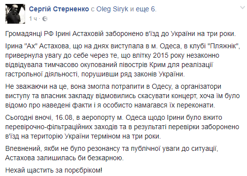 "Ирина "Ах" Астахова, которая на днях выступала в Одессе, в клубе "Пляжник", привлекла внимание к себе из-за того, что летом 2015 незаконно посещала временно оккупированный Крым для реализации гастрольной деятельности, нарушив ряд законов Украины.