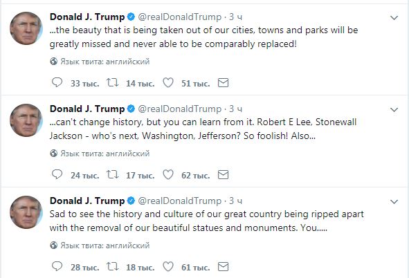 "Грустно видеть, как историю и культуру нашей страны разрывают сносы наших прекрасных статуй и памятников. Мы не можем изменить историю, но мы можем извлечь из нее уроки. Роберт Ли, Стоунуолл Джексон - кто следующий? Вашингтон? Джефферсон? Как глупо!" - написал он на своей странице в твиттере.