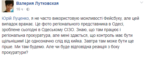 В комментарии к посту с просьбой направить выездную комиссию в СИЗО, Юрий Луценко написал: "Выезжает комиссия ГПУ".