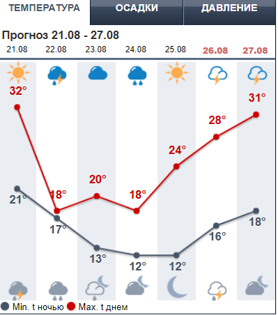 Ресурс Мeteoprog.ua также пишет, что с +32 в понедельник температура упадет до +18...+24 в середине недели и вновь поднимется к отметке +31 только в воскресенье. Дожди прогнозируют 22, 24 августа и на выходных 26-27-го.