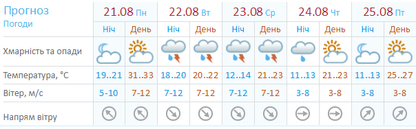Сайт Укргидрометцентра обещает резкое снижение температуры и дожди со вторника. Если в понедельник будет +33, то во вторник, среду и четверг +20...+23. С четверга потеплеет до +27. Грозы прогнозируют 22 и 23 августа.
