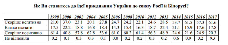 "Процент тех, кто позитивно относится к присоединению Украины к союзу с Россией и Белоруссией, упал с 49% в 2013 году до 25% в 2014 году, и в 2017 году составляет 20%", — говорится в исследовании.
