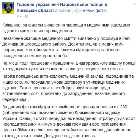 Полиция открыла уголовное производство по факту обнаружения в Вышгородском районе Киевской области свалки медицинских отходов. Об этом сообщает пресс-служба ГУ НП в Киевской области на своей странице в Facebook.