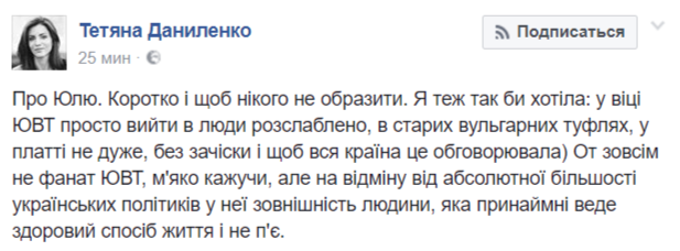 "Я бы тоже так хотела: в возрасте ЮВТ просто выйти в люди спокойно, в старых вульгарных туфлях, в платье не очень, без прически и чтобы вся страна это обсуждала) Вот совсем не фанат ЮВТ, мягко говоря, но в отличие от абсолютного большинства украинских политиков в нее внешность человека, по крайней мере ведет здоровый образ жизни и не пьет", пишет Татьяна.