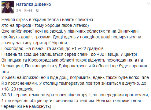 "В Киеве ближайшей ночью пойдет дождь, погремел, днем также будет сыро, но и с прояснениями. В столице температура воздуха понизится ощутимо, до + 18 + 20 градусов. 30-31 августа температура снова пойдет вверх. И, по предварительным прогнозам, 1-ое сентября обещает быть солнечным и теплым. Новые костюмы и новые туфли не намокнут", - написала она.