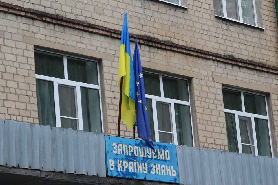 В Донбассе, контролируемом Украиной, линейки шли даже на линии фронта. В одной из школ Авдеевки наравне с украинским повесили флаг Евросоюза.