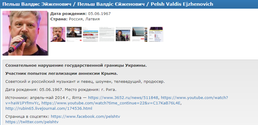 На сайте указано, что Пельша занесли в список за "сознательное нарушение государственной границы Украины", и что он "участник попыток легализации аннексии Крыма".