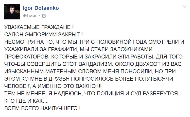 Тем временем, сам владелец магазина Игорь Доценко сообщил в Facebook, что салон "Эмпориум" - закрыт. При этом он утверждает, что граффити смыли отнюдь не сотрудники магазина, а какие-то провокаторы (что, впрочем, не подтвеждается ни очевидцами, ни предыдущей реакцией самого Доценко, который ранее призывал не поднимать шум из-за граффити).