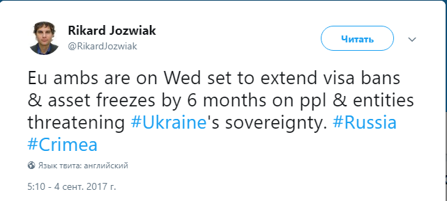 "Послы ЕС в среду должны продолжить визовые запреты и замораживание активов на 6 месяцев для лиц и компаний, угрожающих суверенитету Украины", - написал Йозвяк.