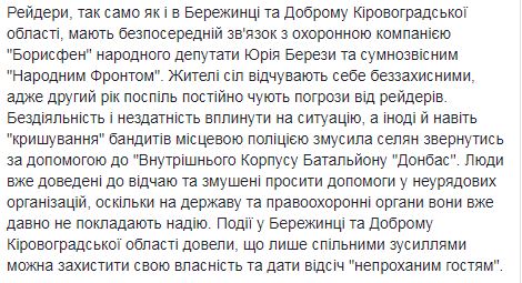 В сообщении сказано, что селяне пригласили "Внутренний Корпус Батальона "Донбасс" для защиты своей земли и помощи в обороне против "рейдеров".