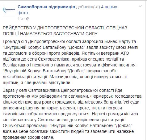 Там отмечается, что сейчас в Святовасильевке идет противостояние между рейдерами и крестьянами. "Фермерские хозяйства нескольких сел уже два года страдают от местных бандитов. Все суды выносили решение в пользу крестьян, однако, давление и угрозы самовольно забрать землю продолжаются. Сейчас общины нескольких сел собираются в Святовасильевке для решения этой ситуации. Ожидаются провокации", - отмечается в сообщении.