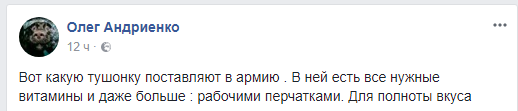 "Вот какую тушенку поставляют в армию. В ней есть все нужные витамины и даже больше: рабочие перчатки. Для полноты вкуса", - пошутил он.