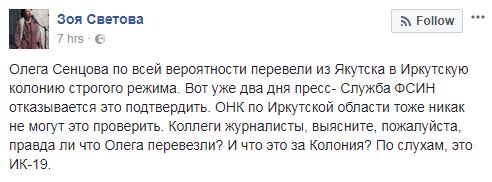 Светова сообщила, что "на днях" Сенцова перевели в Иркутске колонию строгого режима, вероятно, ИК-19, но пока эту информацию российские органы не подтвердили.