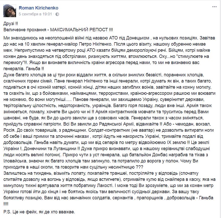 "Обидно слышать из уст генерала, что батальон "Донбасс", награбив, бежал из Иловайска, зная, как много ребят там погибло и попало к врагу в плен. Почему вы приходите в наши окопы и несете чушь?" — написал Кириченко.