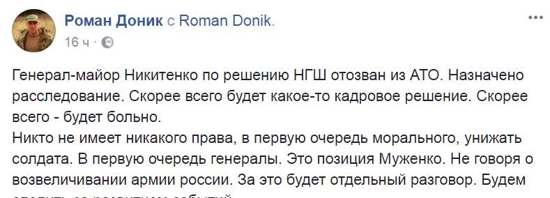 "Генерал-майор Никитенко по решению НГШ отозван из АТО. Назначено расследование. Скорее всего будет какое-то кадровое решение. Скорее всего - будет больно. Никто не имеет никакого права, в первую очередь морального, унижать солдата. В первую очередь генералы. Это позиция Муженко. Не говоря уже о возвеличивании армии России. За это будет отдельный разговор. Будем следить за развитием событий", - пишет Доник.
